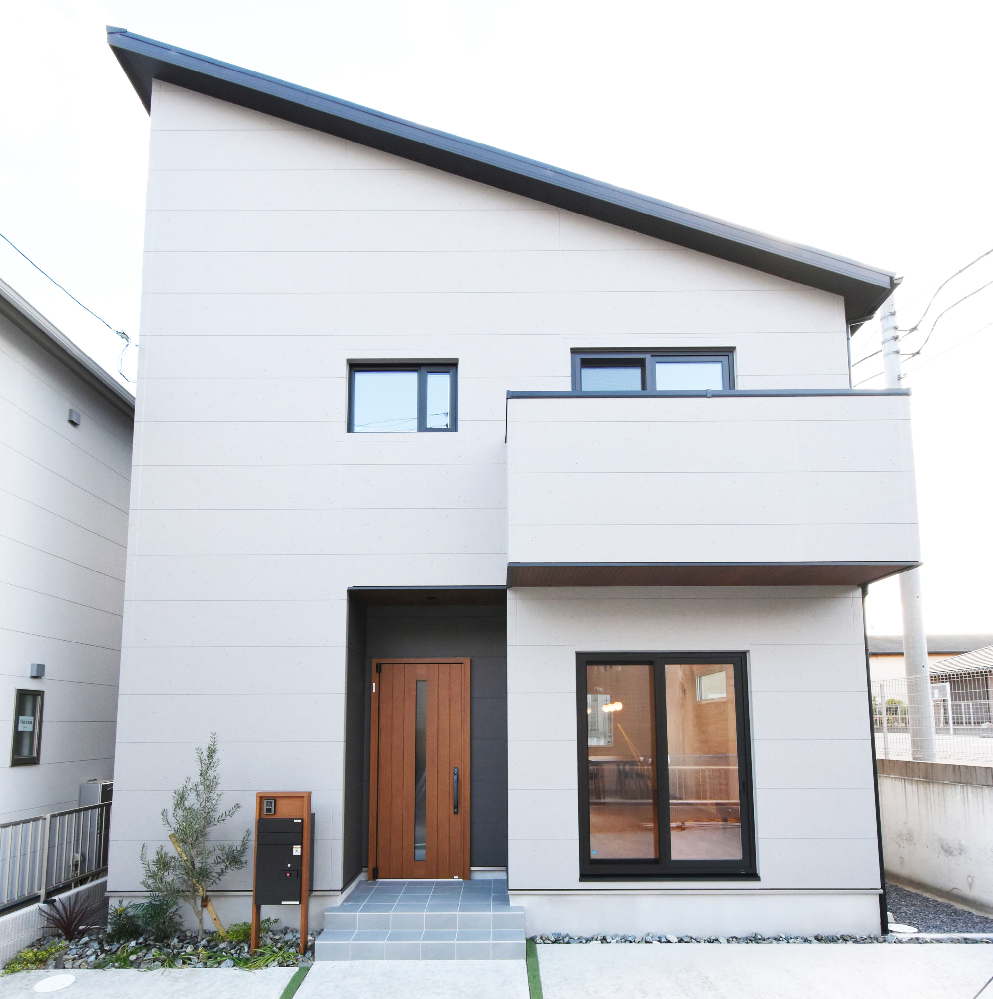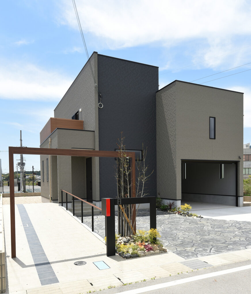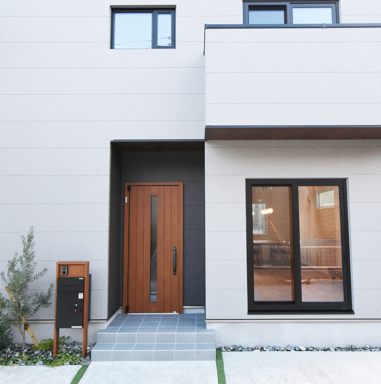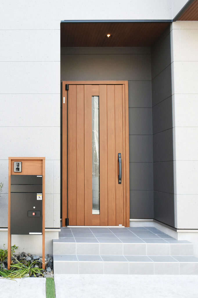 木目の美しいドアが、モダンな外観に温かみを加えます 。