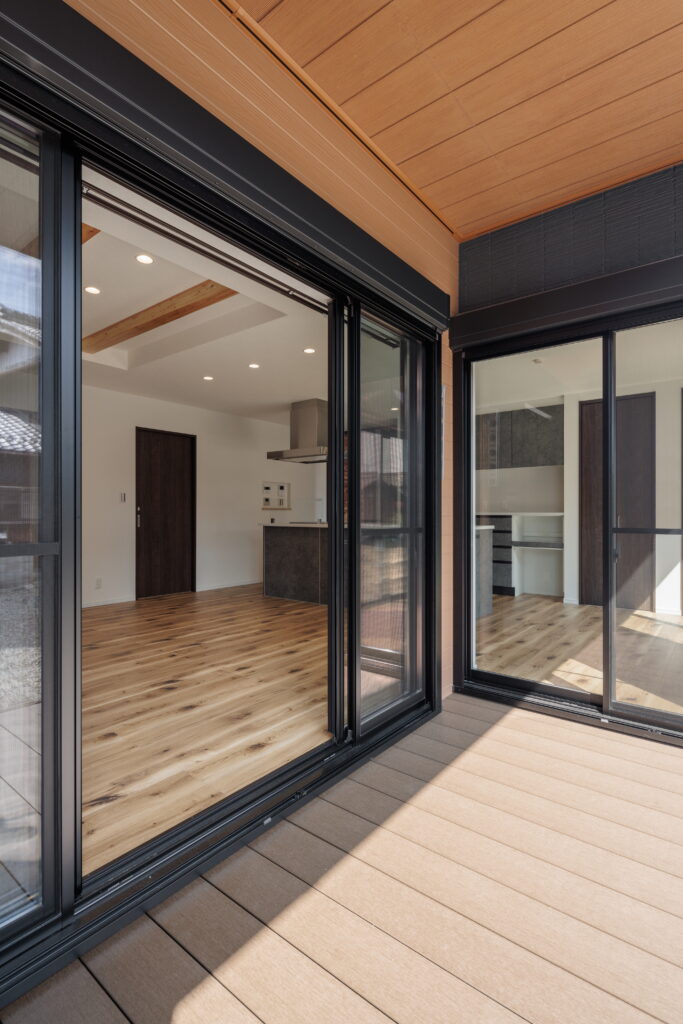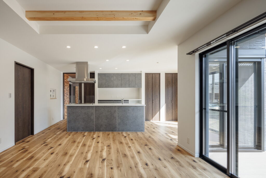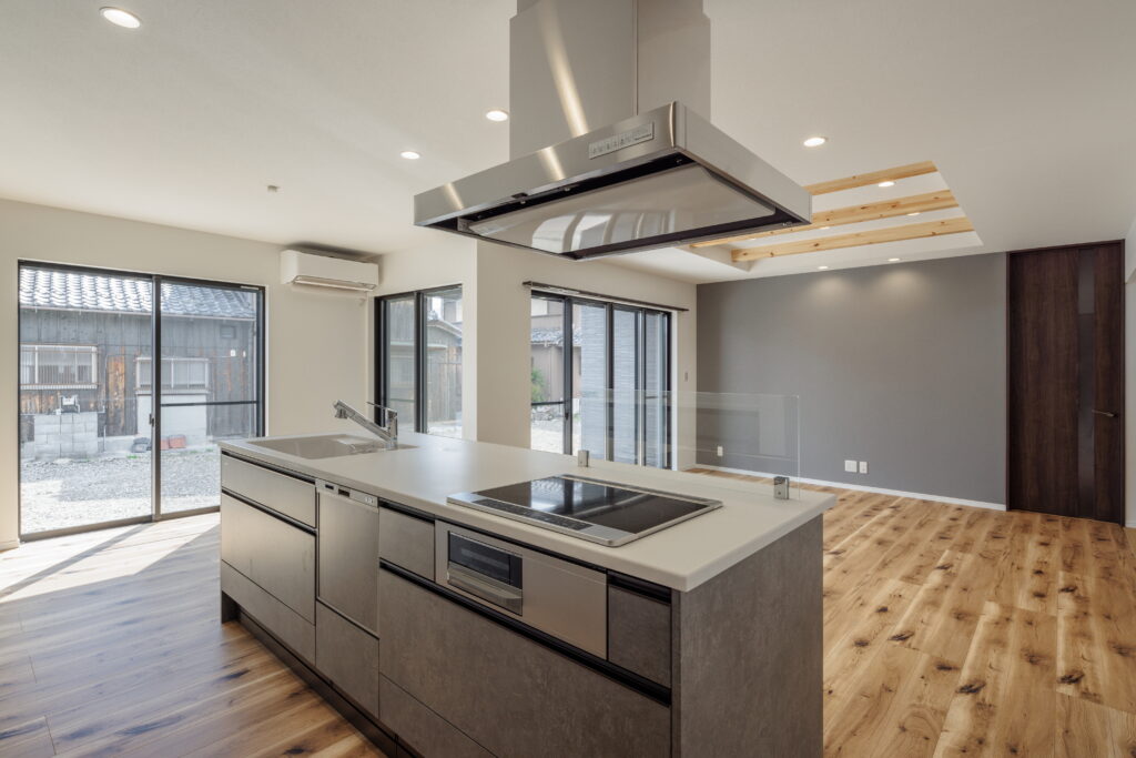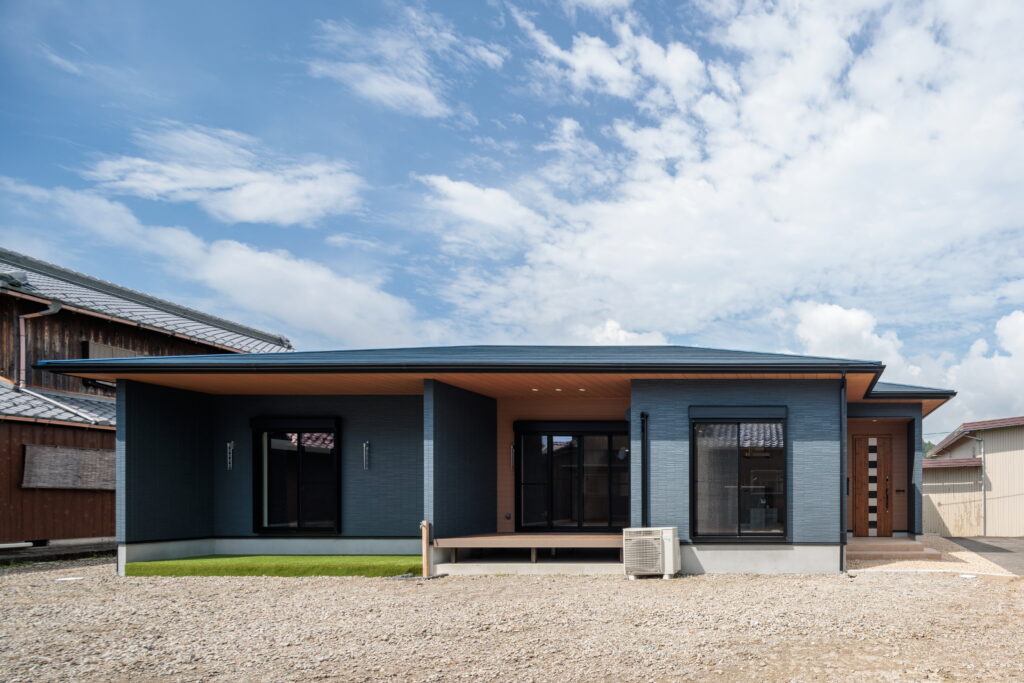 軒が広がる平屋の住まい 所在地 | 滋賀県大津市階数 | 平屋間取り | 3LDK延床面積| 100.20㎡ 大きな軒のある人気の平屋。夏の暑い日差しを程よく遮ってくれる「軒」と、大きな窓とテラスのある伸びやかな大空間!軒下は内とも外とも使える人気の空間です。アイランドキッチンを中心に家族の気配が感じられる間取りとなっています。 奥行きも幅もあるゆったりした玄関なので、当校や出勤が重なっても混雑しません!奥には広いシューズクロークもあります。正面の無垢材で作ったデザインパネルが玄関をグレードアップしてくれています。 アイランドキッチンを中心に、家族が集えるLDK。玄関にも水廻りにも近く、家事動線が考えられたレイアウトです。LDKの扉の向こうは、洋室とウォークインクローゼットのプライベート空間になっています。 LDKからフラットに床が延び、深い軒下のテラスまでひと続きで使える空間。大きな開口を設け、見晴らしのいいLDKとなっています。軒のおかげで、光熱費の節約にもつながります!