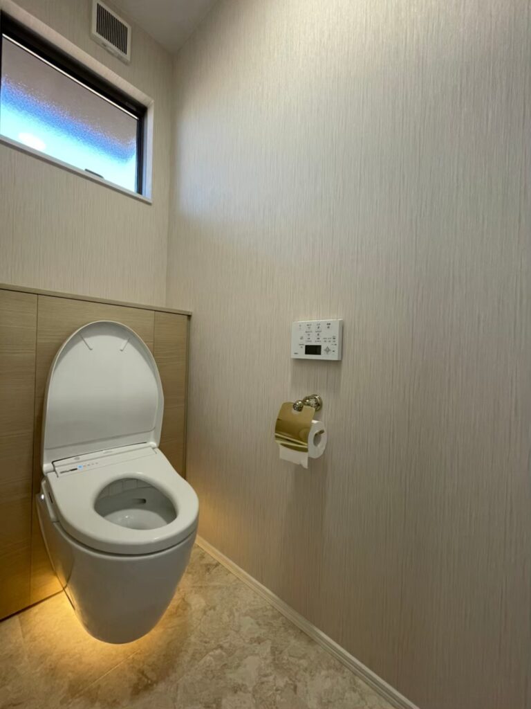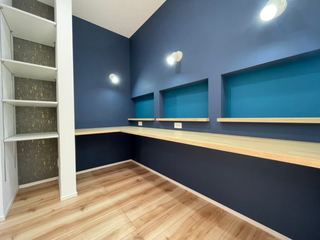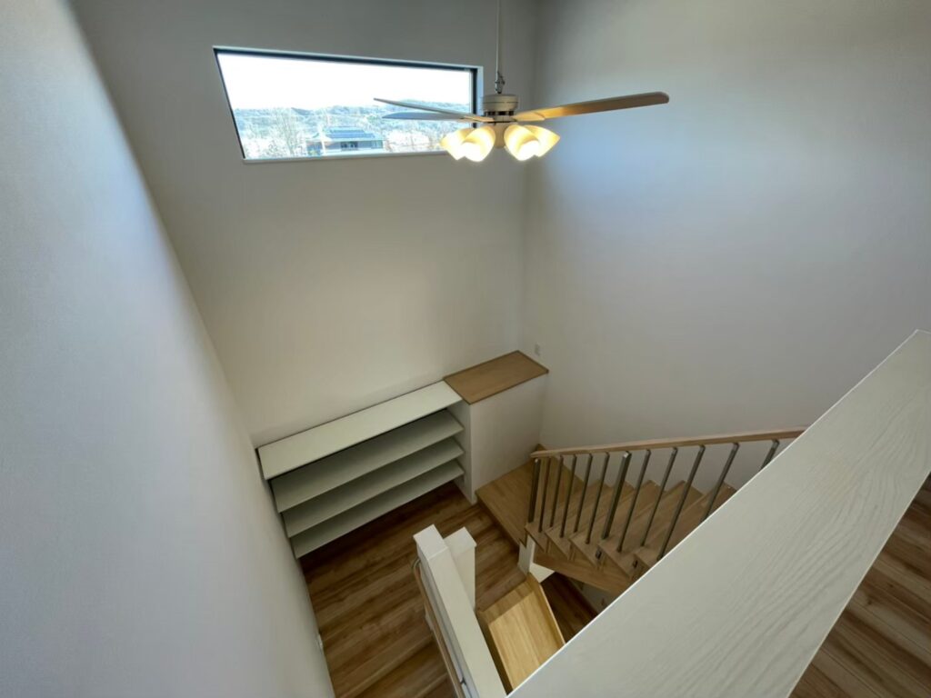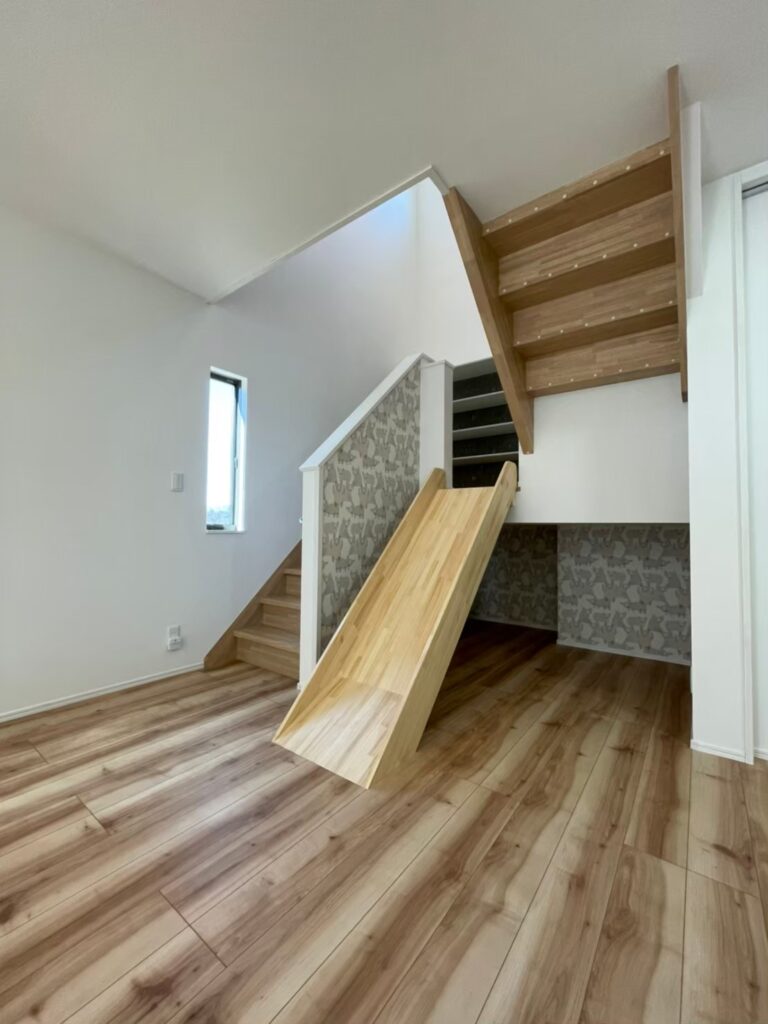 滑り台と秘密基地 階段 階段の踊り場に棚を設けて本やディスプレイに。そこから滑り台で降りると、階段下は秘密基地!この天井の低さや奥まった感じがワクワクします! 収納充実のLDK キッチンカウンターに、もう1段棚を設置しました。この1段の役割は大きく、リモコンやティッシュなどダイニングテーブルに置きっぱなしになりがちなものの居場所になります! スタディコーナー LDKの一角に作ったスペースです。キッチンから近いので、お子様の勉強の様子がすぐ見れます!また在宅ワークが増え、ワークスペースをご希望されるお客様も増えています。 フロートトイレ 床から浮いているホテルのようなトイレです!背面のキャビネットに掃除道具を収めてスッキリ!浮いていることで床下のお掃除がすごく楽になり、フロアライトで心地いいい空間を演出してくれます! 所在地 | 奈良県香芝市階数 | 2階建間取り | 3LDK延床面積| 120.01㎡