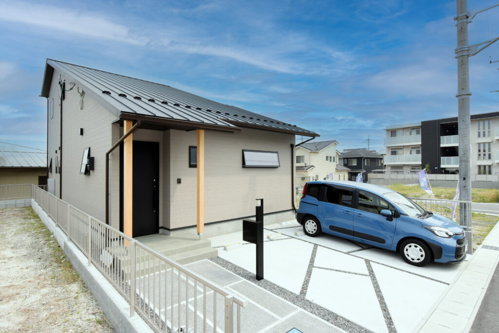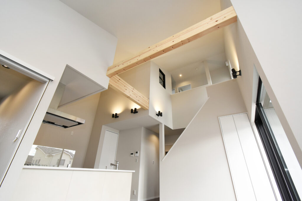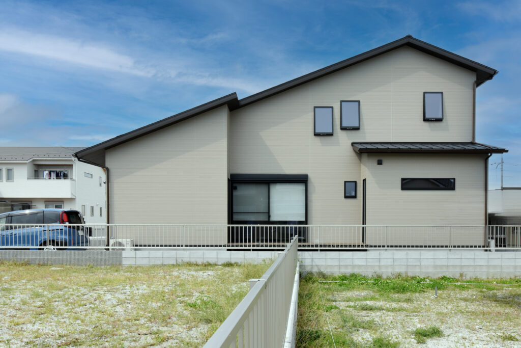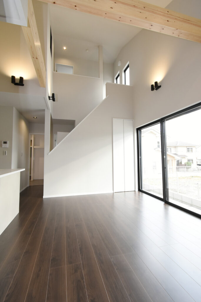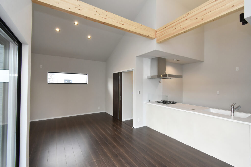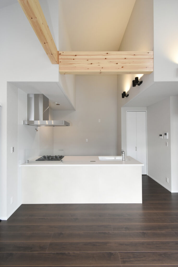 大屋根が美しい、平屋風2階建て 片流れの大屋根が印象的なデザイン 縦長の敷地を活かし、2階から1階まで大屋根をかけたインパクトある外観。道路に面した正面は窓を少なくした静かな表情、そこに大屋根の迫力と、外構のデザインがアクセントになっています。 美しい吹抜けの風景 リビングから2階を見上げると、大屋根の勾配を生かした吹き抜けと梁が交差する美しい風景が目に入ります。リビング階段は、2Fとのつながりという機能面と、インテリアとしての造形面を担っています。薄いグレーのクロスが、部屋の雰囲気をグレードアップしています。 開放的なキッチン! ミディアムカラーのフローリングに対して、ホワイトでまとめたフルフラットの対面キッチンです。キッチン上部も吹き抜けと梁があり、とても開放的!お手伝いや会話が弾みますね。 キレイが保てる玄関 玄関から直接お部屋が見えないので、ちょっとしたお客様なら玄関で十分に対応できます。右側には大容量のシューズクロークがあり、L型に棚を配置して収納量を確保。ベビーカーやゴルフバックも収納しやすいレイアウトです。 寝室 リビングに隣接した位置にある寝室。寝室には大容量のウォークインクローゼットがあり、洗面室、トイレへの動線もスムーズです。プライベート空間なので、窓の形や配置にも工夫しました。 洗面室とお風呂 キッチンからスムーズな動線でつながる洗面室とお風呂。約3帖ある洗面室には、リネン棚があるので、着替えやタオル置き場として便利に使えます。リラックスして入浴できるように、浴室は優しいカラーでまとめました。 トイレ 1Fと2Fのトイレはイメージを変えてコーディネートしました。トイレは独立した空間なので、雰囲気を変えて楽しむのもありです! 所在地 | 滋賀県大津市階数 | 2階建て間取り | 3LDK+納戸延床面積| 102.88㎡(31.12坪)