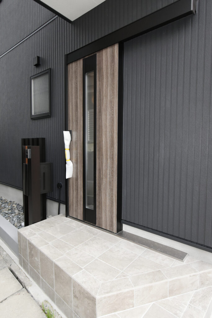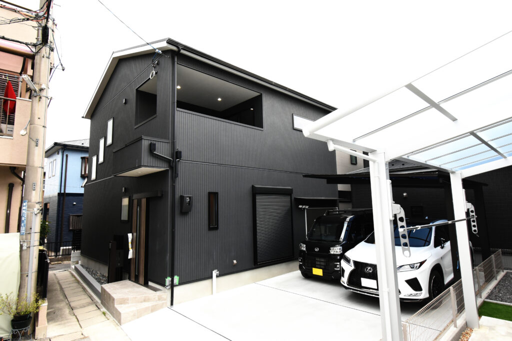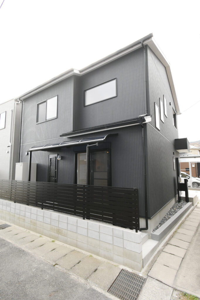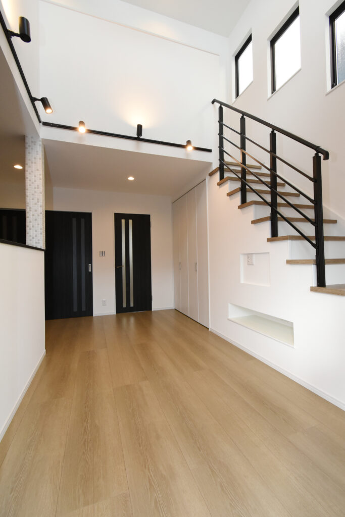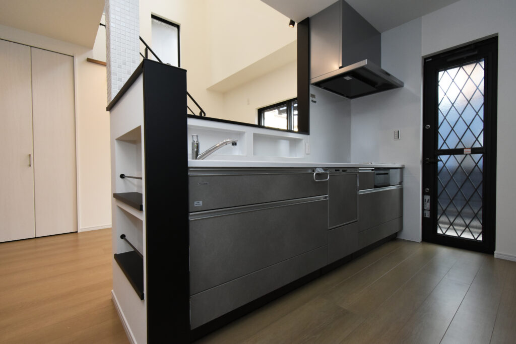ステージのような階段があるLDK 吹抜けのLDK 手すり格子が美しい吹き抜けのあるLDKです。スポットライトとシーリングファンもブラックでコーディネートしたスタイリッシュなインテリア。 黒の外観 ガルバリウム鋼板のようなデザインのサイディングでまとめた外観。その中でラスティックオークの玄関が映えます。 大容量の玄関収納 天井までのトールタイプの玄関収納は、扉にミラーが付けれるので、お出かけ前に便利!最近はシューズクロ―ゼットも多いですが、玄関収納ならホールが広く確保できます! キッチン 食洗器や浄水栓が標準仕様のグレーのキッチン。背面にはキッチンと同じ面材のカップボードも設置することによって、キッチンのグレードがぐっと上がります! 所在地 | 滋賀県大津市階数 | 2階建て間取り | 3LDK+外部物入延床面積| 99.62㎡(30.13坪)