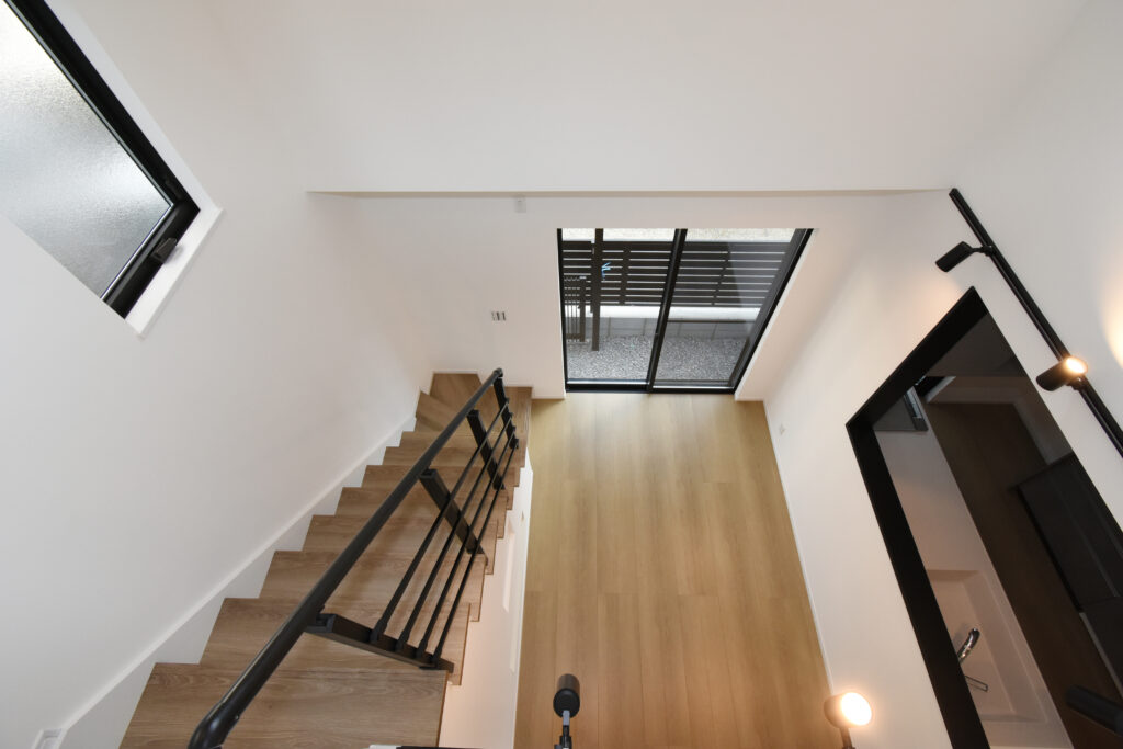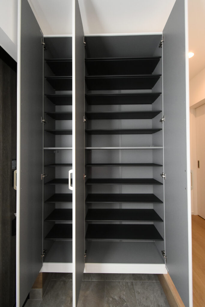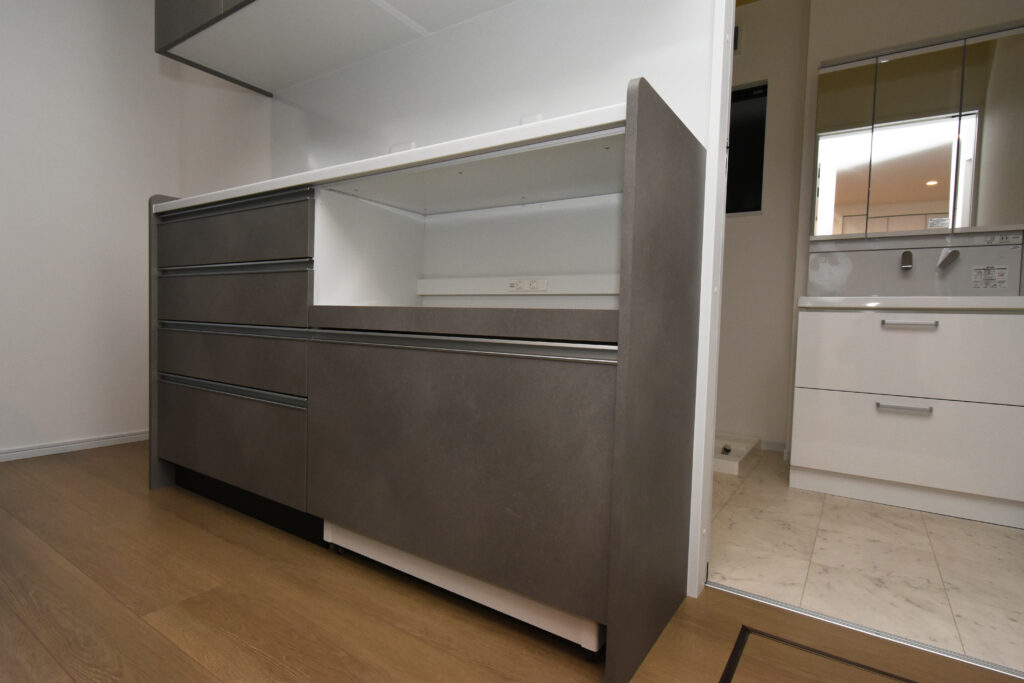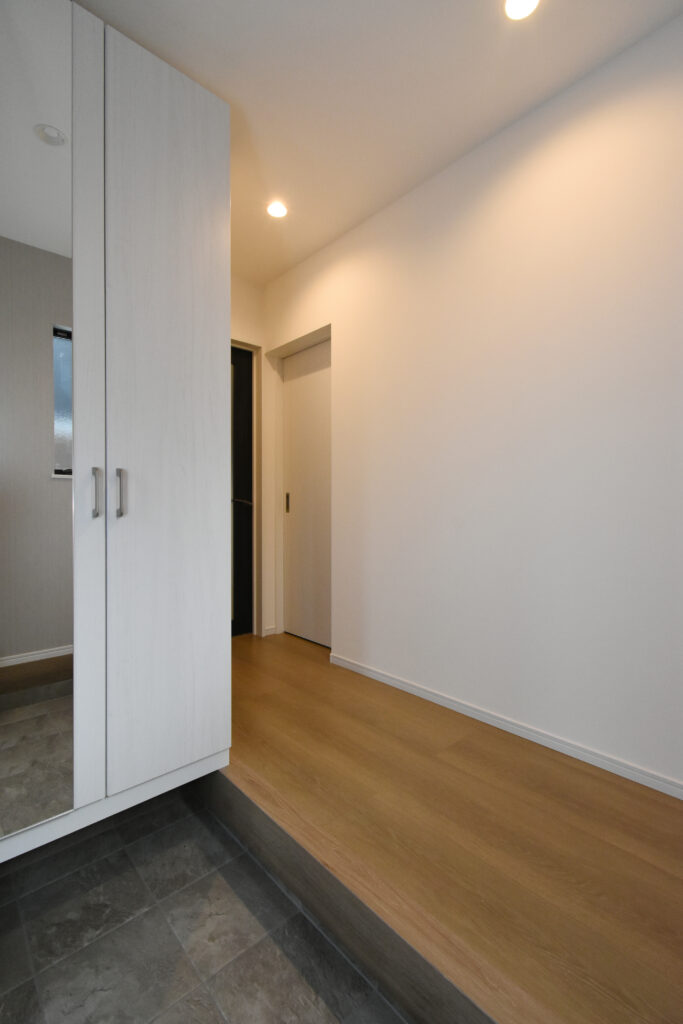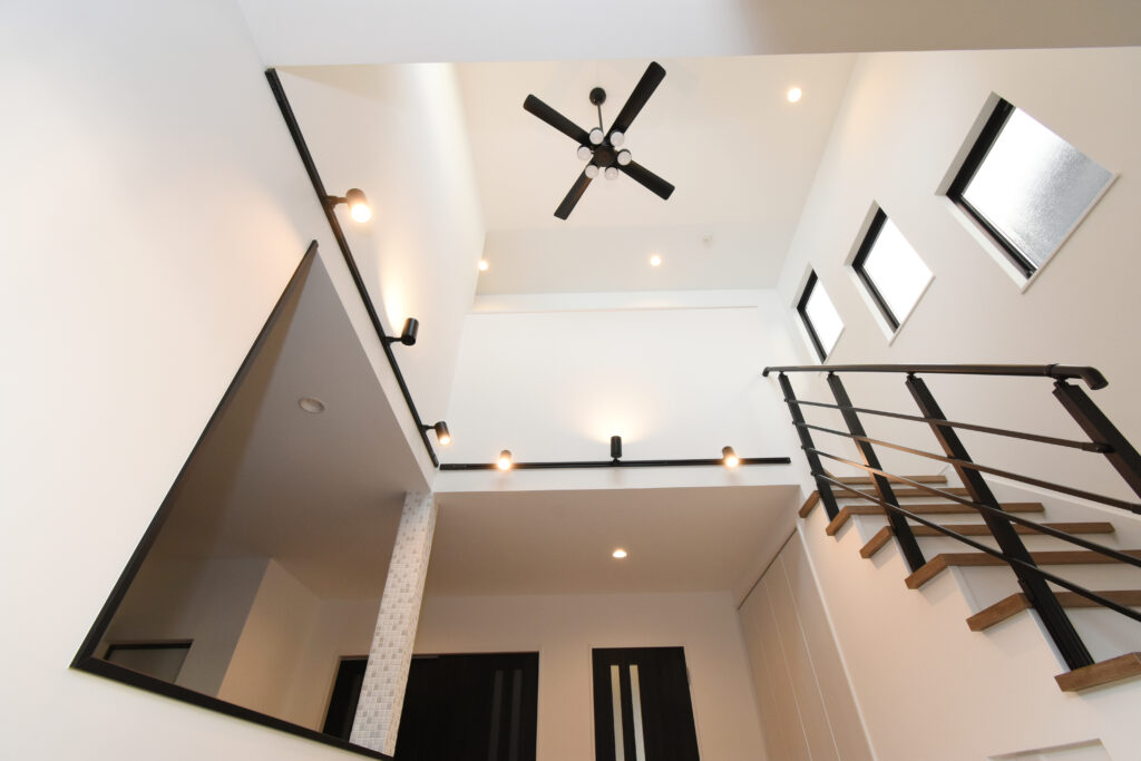 ステージのような階段があるLDK 吹抜けのLDK 手すり格子が美しい吹き抜けのあるLDKです。スポットライトとシーリングファンもブラックでコーディネートしたスタイリッシュなインテリア。 黒の外観 ガルバリウム鋼板のようなデザインのサイディングでまとめた外観。その中でラスティックオークの玄関が映えます。 大容量の玄関収納 天井までのトールタイプの玄関収納は、扉にミラーが付けれるので、お出かけ前に便利!最近はシューズクロ―ゼットも多いですが、玄関収納ならホールが広く確保できます! キッチン 食洗器や浄水栓が標準仕様のグレーのキッチン。背面にはキッチンと同じ面材のカップボードも設置することによって、キッチンのグレードがぐっと上がります! 所在地 | 滋賀県大津市階数 | 2階建て間取り | 3LDK+外部物入延床面積| 99.62㎡(30.13坪)