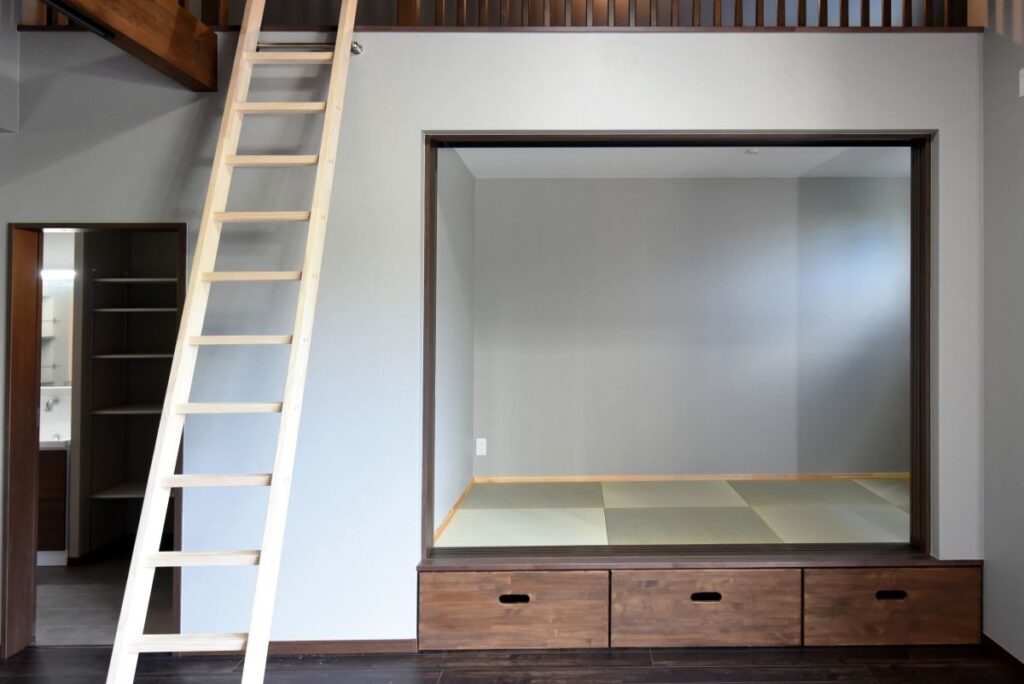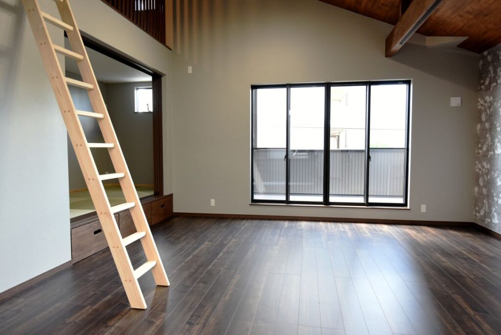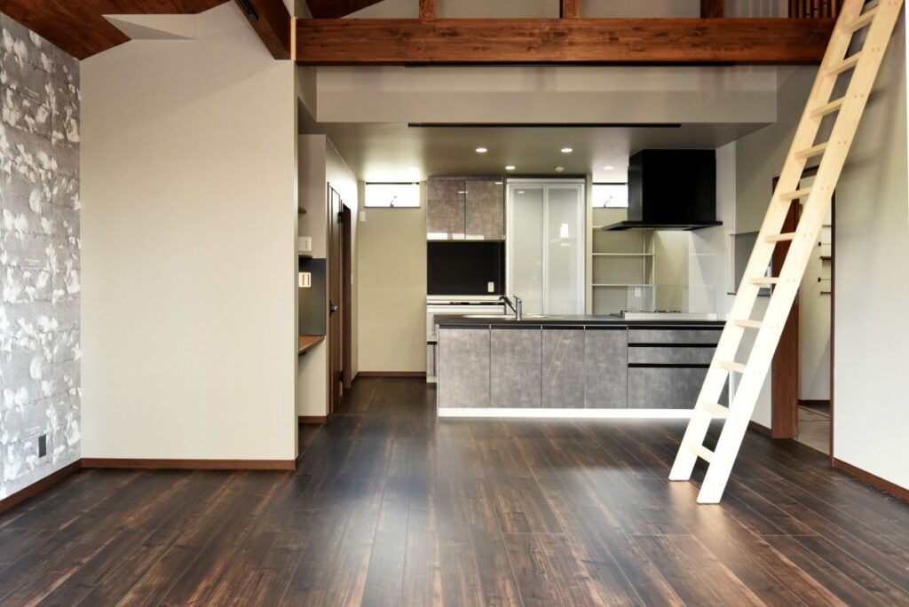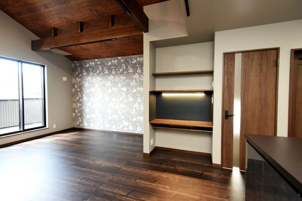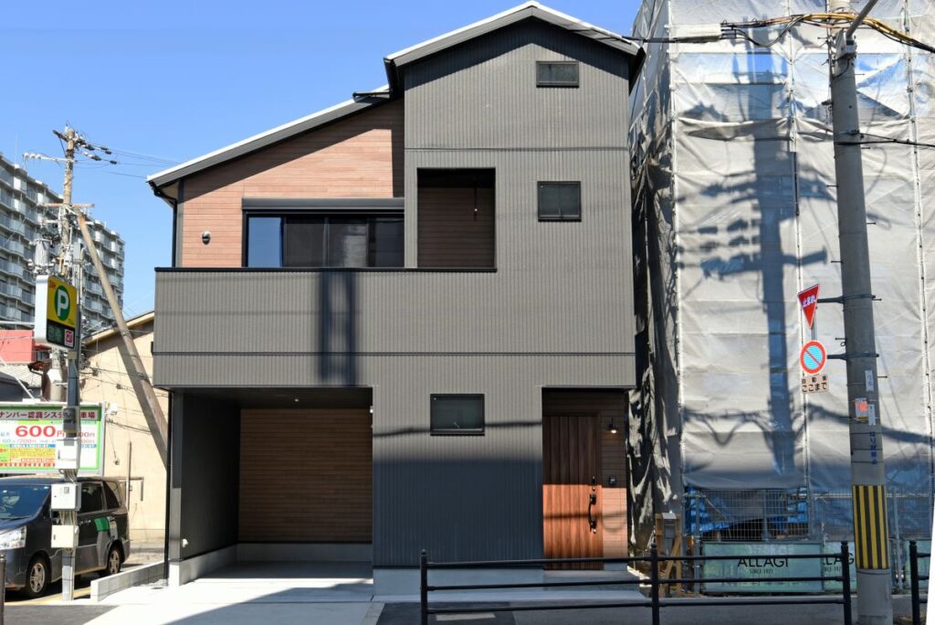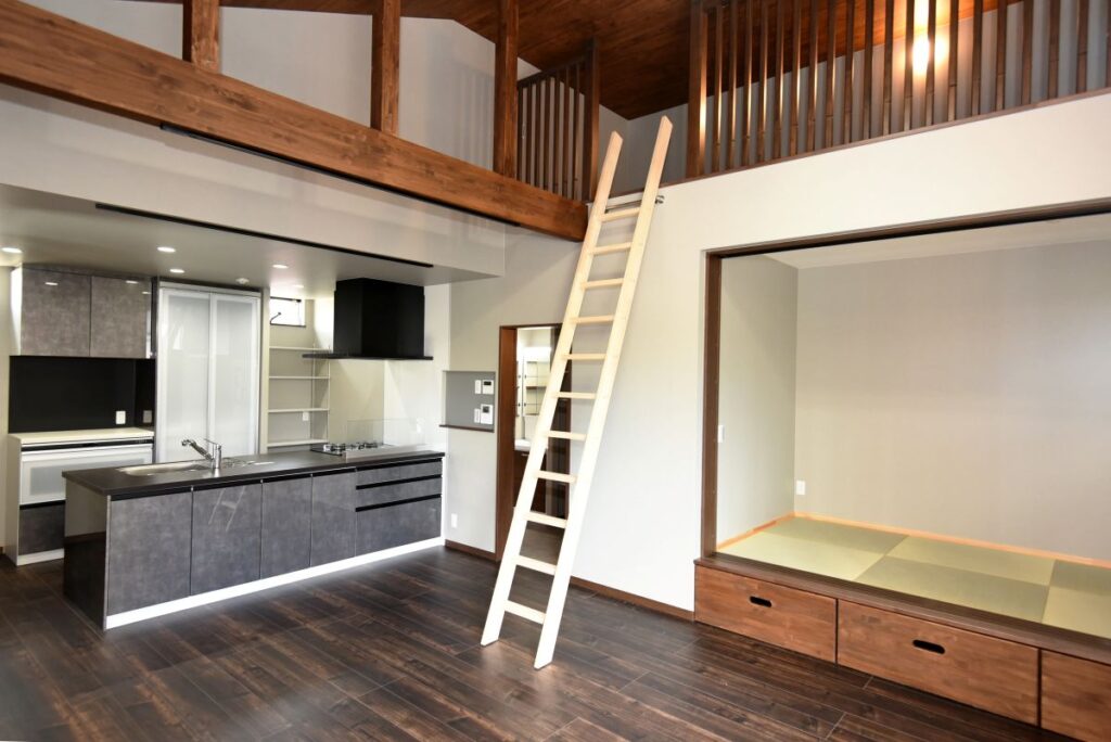 勾配天井の伸びやかなリビング 勾配天井のLDK 住宅密集地ですが、2Fにリビングを配置したので明るく、また屋根勾配を活かした伸びやかな空間となっています。見せ梁とロフトの効果で、縦の広がりも感じられます。 小上がりの和室は、ちょっと座れるし、畳下に収納スペースも取れるのでとても便利です。リビング一角の造付カウンターはワークスペースに。 フルフラットキッチン マットなブラック天板がかっこいいキッチン。フルフラットなので圧迫感もなく、おしゃれ感もかなりアップ。ダイニング側は収納になっています。 仕切れる子供部屋 今は1部屋で広く使って、将来は2つに仕切って使えるようにドアは2ヶ所設けています。 木と黒の外壁 部分的に木調サイディングを貼り分けて、メリハリをつけた外観。表情豊かになります!またビルトインガレージもあるので愛車を雨風から守ります。 水廻り 2Fに集約した水廻りスペース。2Fで家事が完結するから便利です!アクセントクロスを使ったトイレと洗面コーナーは可愛いコーディネート! 所在地 | 大阪府大阪市階数 | 2階建て間取り | 4LDK+ロフト延床面積| 97.70㎡