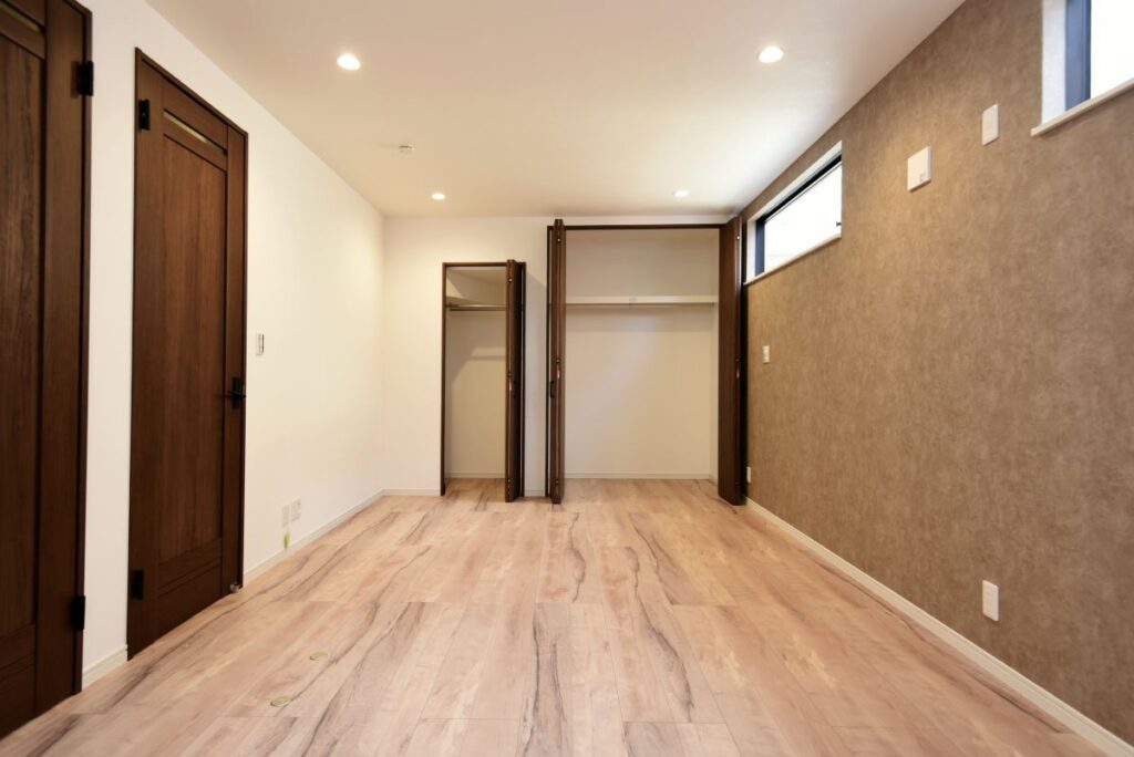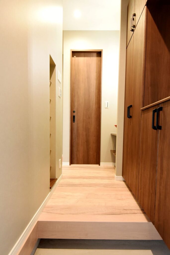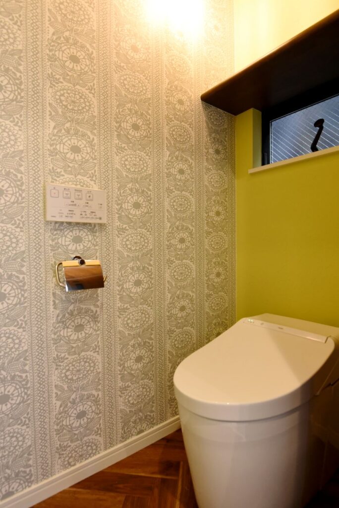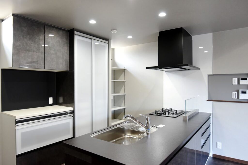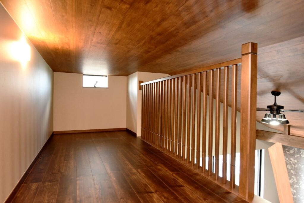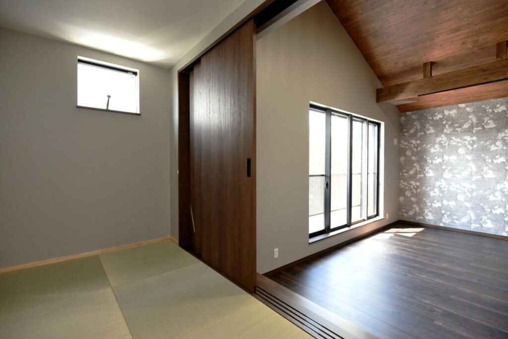勾配天井の伸びやかなリビング 勾配天井のLDK 住宅密集地ですが、2Fにリビングを配置したので明るく、また屋根勾配を活かした伸びやかな空間となっています。見せ梁とロフトの効果で、縦の広がりも感じられます。 小上がりの和室は、ちょっと座れるし、畳下に収納スペースも取れるのでとても便利です。リビング一角の造付カウンターはワークスペースに。 フルフラットキッチン マットなブラック天板がかっこいいキッチン。フルフラットなので圧迫感もなく、おしゃれ感もかなりアップ。ダイニング側は収納になっています。 仕切れる子供部屋 今は1部屋で広く使って、将来は2つに仕切って使えるようにドアは2ヶ所設けています。 木と黒の外壁 部分的に木調サイディングを貼り分けて、メリハリをつけた外観。表情豊かになります!またビルトインガレージもあるので愛車を雨風から守ります。 水廻り 2Fに集約した水廻りスペース。2Fで家事が完結するから便利です!アクセントクロスを使ったトイレと洗面コーナーは可愛いコーディネート! 所在地 | 大阪府大阪市階数 | 2階建て間取り | 4LDK+ロフト延床面積| 97.70㎡