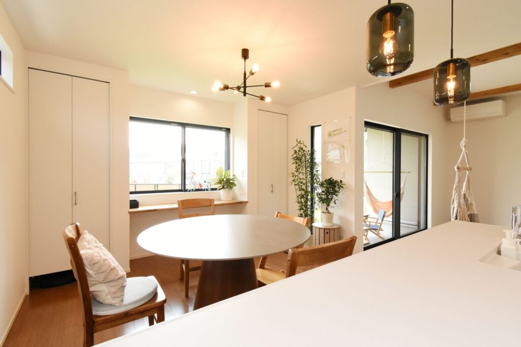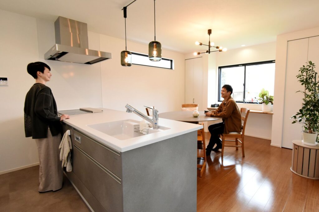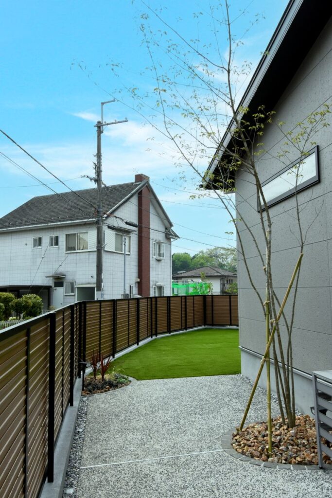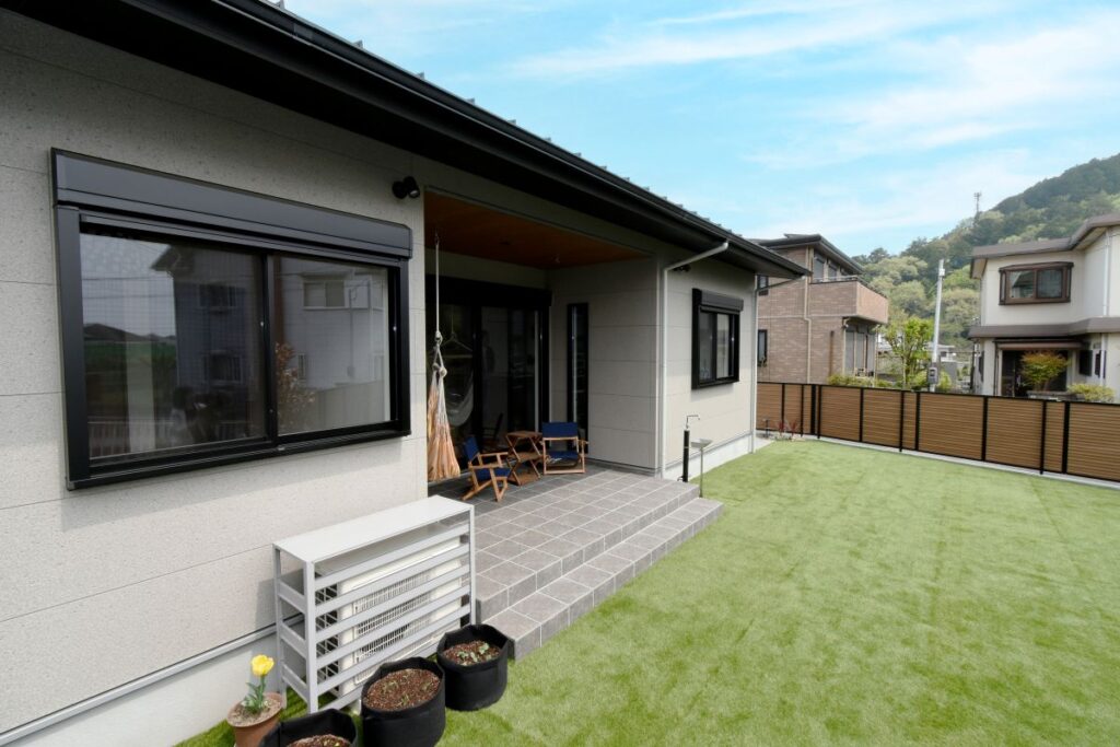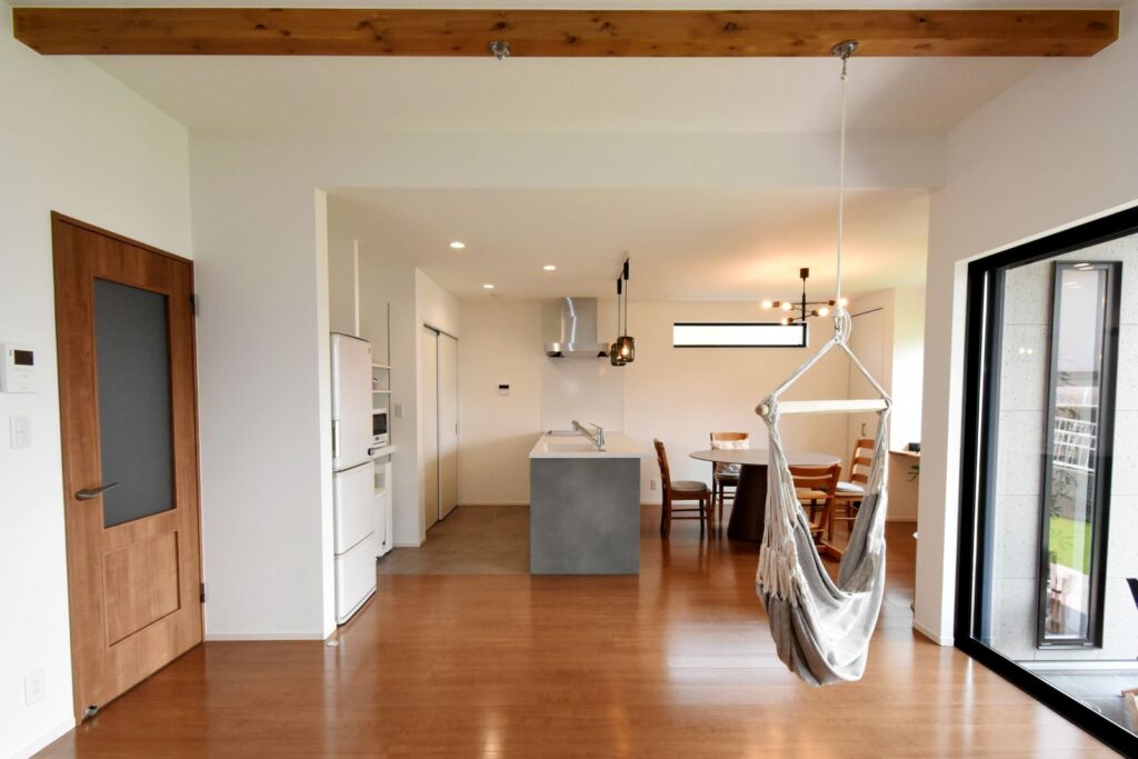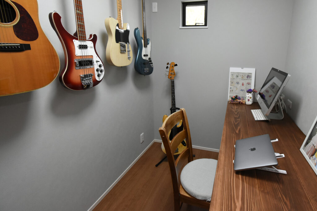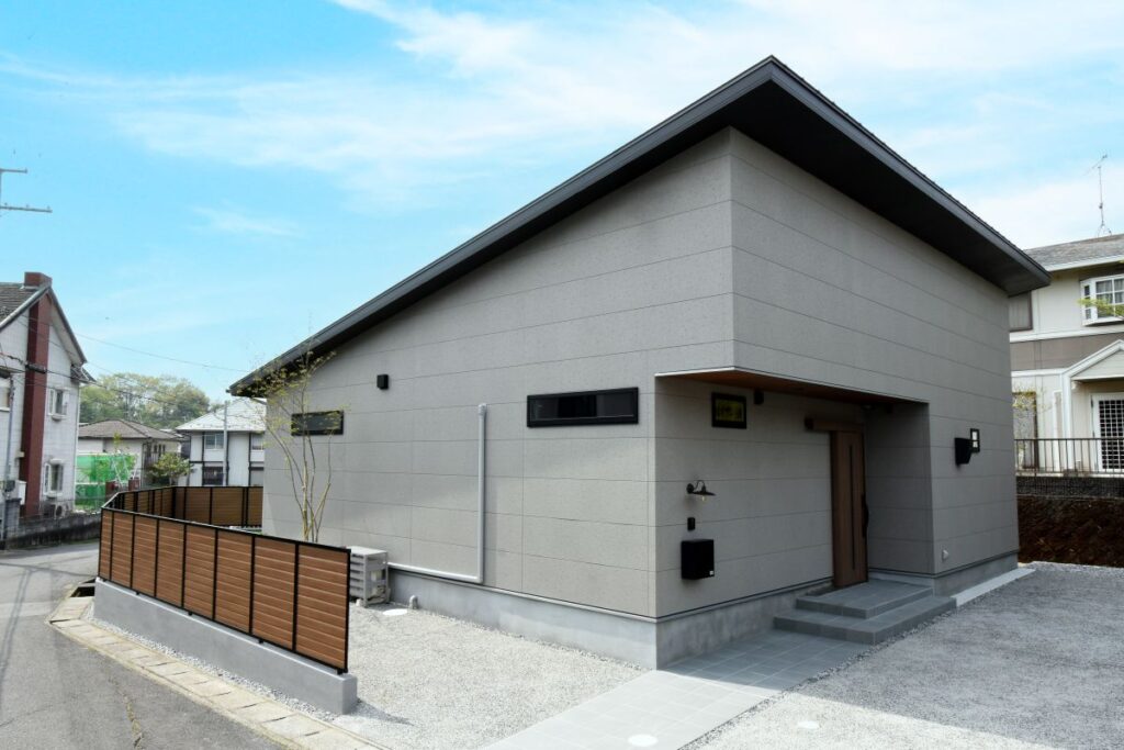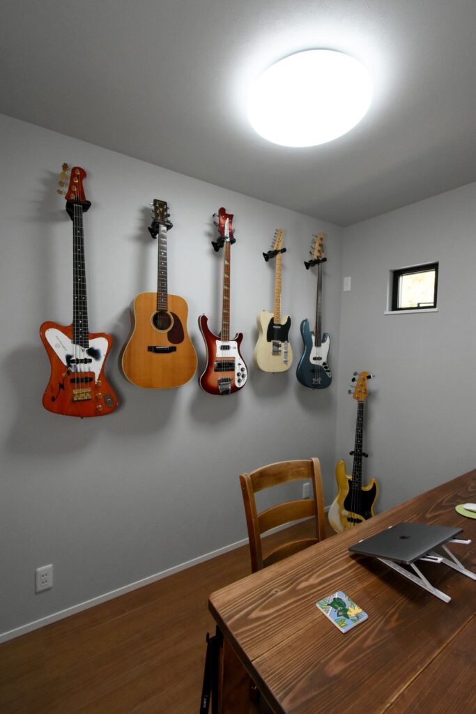 子育て世帯が選んだ平屋建て お庭に向かってオープンなデザイン グレー×木の調和が美しい平屋のお住まい。道路側は小さめの窓でプライバシーを守り、広いお庭側に開けた明るいリビング。当社設計士を交えながらしっかりとプランの打合せをし、手書き図面とパースの提案にほれ込んでくださいました。 使いやすさとデザイン性のある玄関 シャープな片流れの外観に、木目調の軒天と玄関引戸が自然で温かみのある印象を与えてくれます。照明、ポストはブラックで統一した整った表情の玄関です。 収納量抜群の玄関 上がり框を斜めに配置することで少し広くなった土間に、お子様の自転車がちょうど格納できました。シューズクロークには靴や傘などが整然と収納され、身支度のしやすさが想像できます。 家具も収納も計算されたLDK 家の中心にあり、家族が自然と集まるLDK。フルフラットキッチンは天板が広くて使い勝手がよく、お料理中も会話が弾みます!スッキリ暮らしたいとのご要望で、窓際の両サイドに収納を設け、書類やルンバの基地としました。家具と照明でどこを見ても美しくコーディネートされています。 梁とハンモック リビングの家具は「ハンモック」だけという気持ちよさ。テレビやテレビ台は置かず、プロジェクター用壁紙に映像や時計も映すスタイルです。 仕事部屋 ミュージシャンのご主人様のかっこいい仕事部屋。楽器を壁掛けにする前提で、下地も入れてあります。壁の幅ぴったりサイズのデスクは、なんとご主人様のお父様が作られたそうです! 子供部屋と寝室 お父様の影響か、かっこいいドラムセットがある子供部屋。お子様が片づけしやすい工夫がいっぱい!寝室は高窓にして、ゆっくり休める空間に。 水廻り空間 洗面室と脱衣室は引戸で仕切ることができるので、お風呂と洗面が同時に使えて便利!室内干しのため、脱衣室にはパイプも設置しました。そしてカフェのようなおしゃれなトイレ空間!照明の反射が映えるように、濃いめのクロスをお選びいただくよう設計からアドバイスさせていただきました。トイレシールもおしゃれです♪ 庭と外構の役割 人工芝を敷き詰めた広いお庭。タイル仕上げのテラスは、室内とも室外とも使えるゆとりの空間です。植栽が美しく配置されたアプローチは、シンボルツリーの成長も楽しみな空間!家の付加価値を上げてくれる外構までこだわった素敵なマイホームの完成です。 所在地 | 滋賀県大津市階数 | 平屋建て間取り | 3LDK延床面積| 84.05㎡(25.42坪)
