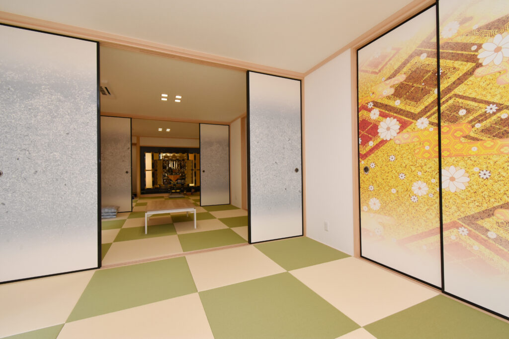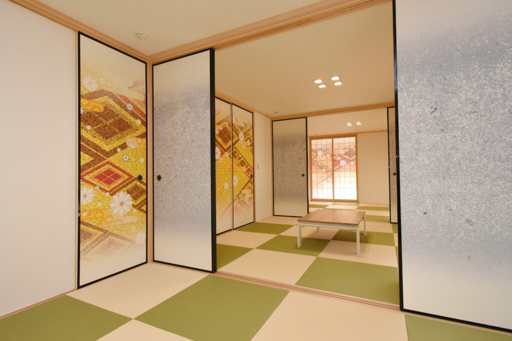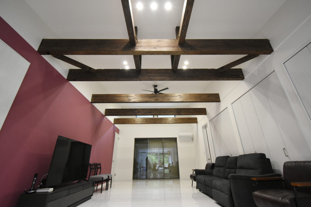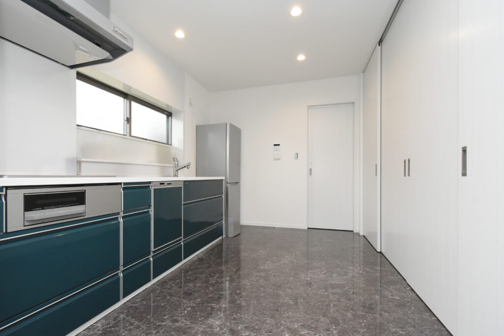 勾配天井の開放感あふれるLDK 勾配天井のLDK ダイナミックな化粧梁が並ぶ圧巻のLDKです。天井も高く、縦にも横にも広がりのある空間は、1面だけアクセントクロスを入れて空間を引き締めています。 ゆったりした大屋根の外観 広大な高台の敷地に建つ、70坪の平屋建て。建物の幅も奥行きもあり、堂々とした外観です。掃き出し窓前にはテラスを作り、中と外をゆったり繋いでいます。 キッチン 壁付けのワイドなシステムキッチン。大理石柄の床はお手入れしやすく、光沢が美しい。右側の扉は大容量のパントリーです! 3間続きの和室 最近には珍しい3間続きの和室。床の間、仏間、広縁もある本格的な仕様です。着物のような古典柄の襖も格式高くて素敵です。 玄関 広い玄関ホールの正面にアクセントクロスを貼り、ディスプレイコーナーとして演出しました。 所在地 | 滋賀県大津市階数 | 平屋建て間取り | 6LDK延床面積| 256.91㎡(77.71坪)
