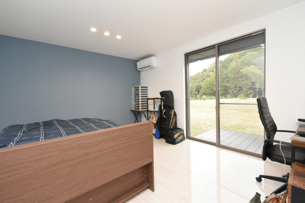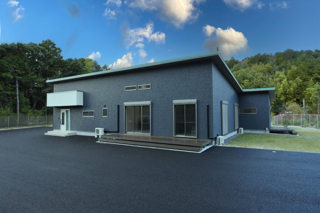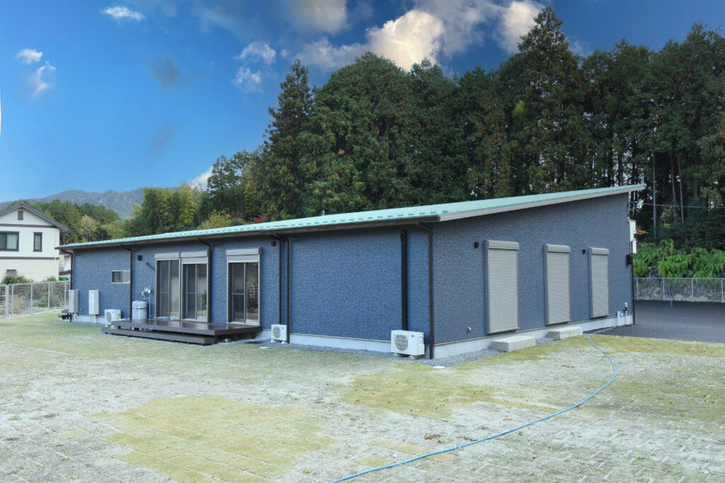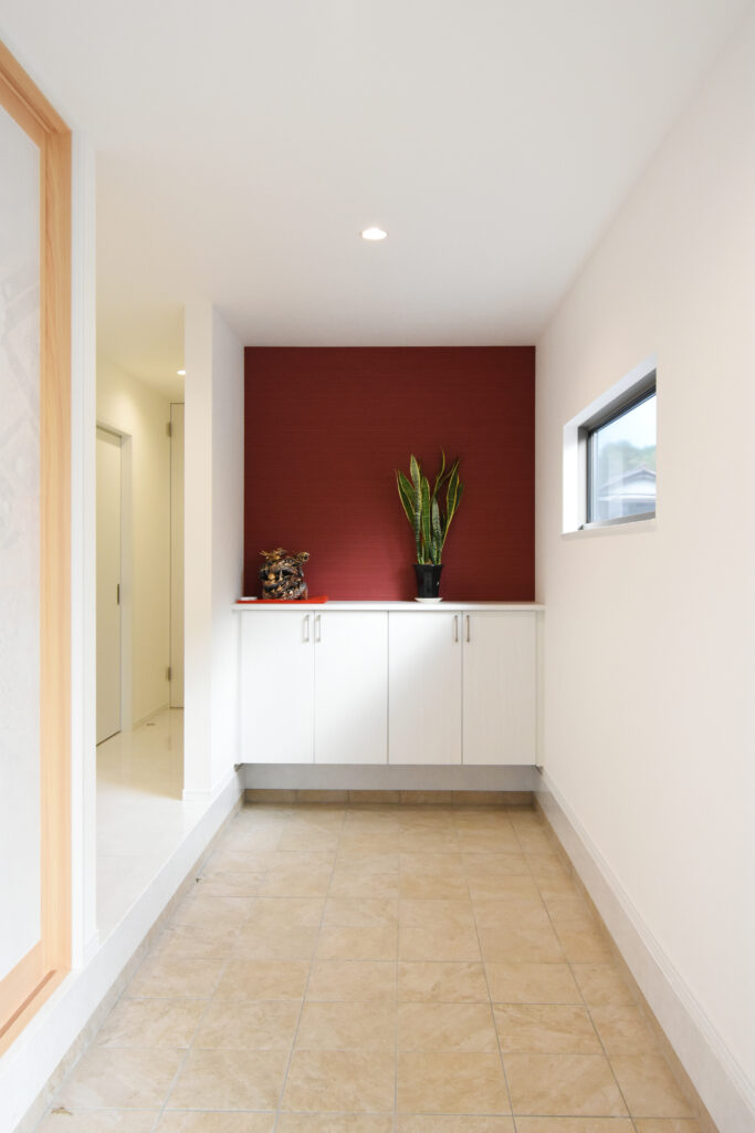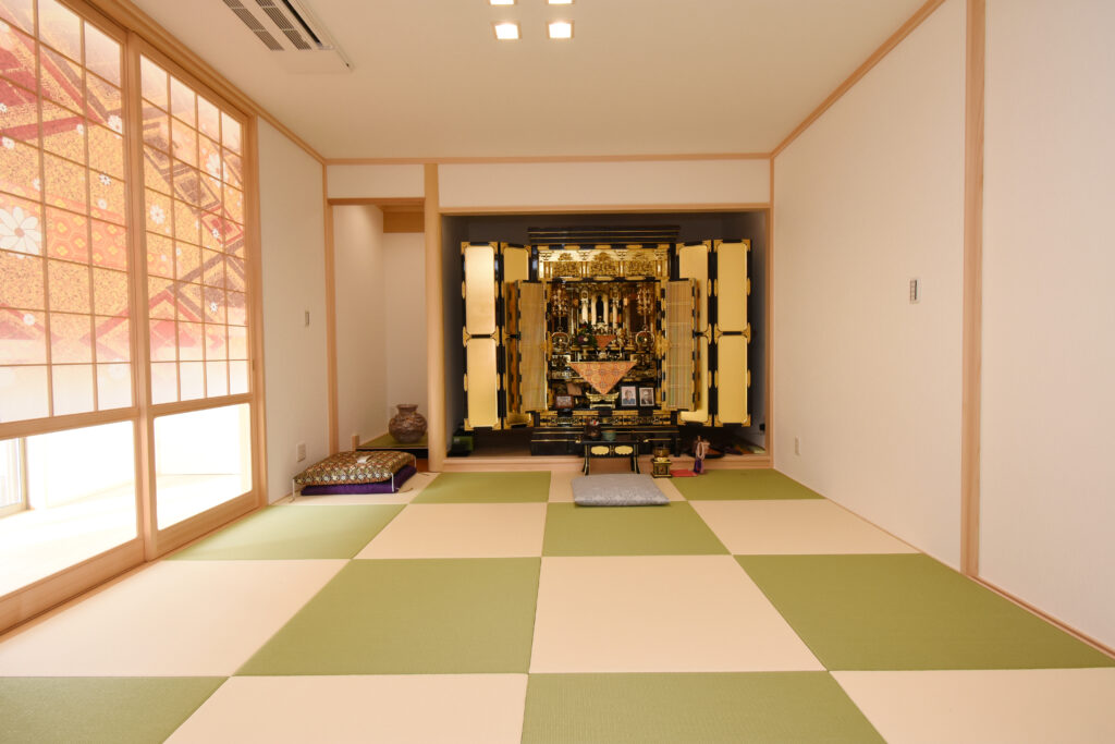 勾配天井の開放感あふれるLDK 勾配天井のLDK ダイナミックな化粧梁が並ぶ圧巻のLDKです。天井も高く、縦にも横にも広がりのある空間は、1面だけアクセントクロスを入れて空間を引き締めています。 ゆったりした大屋根の外観 広大な高台の敷地に建つ、70坪の平屋建て。建物の幅も奥行きもあり、堂々とした外観です。掃き出し窓前にはテラスを作り、中と外をゆったり繋いでいます。 キッチン 壁付けのワイドなシステムキッチン。大理石柄の床はお手入れしやすく、光沢が美しい。右側の扉は大容量のパントリーです! 3間続きの和室 最近には珍しい3間続きの和室。床の間、仏間、広縁もある本格的な仕様です。着物のような古典柄の襖も格式高くて素敵です。 玄関 広い玄関ホールの正面にアクセントクロスを貼り、ディスプレイコーナーとして演出しました。 所在地 | 滋賀県大津市階数 | 平屋建て間取り | 6LDK延床面積| 256.91㎡(77.71坪)